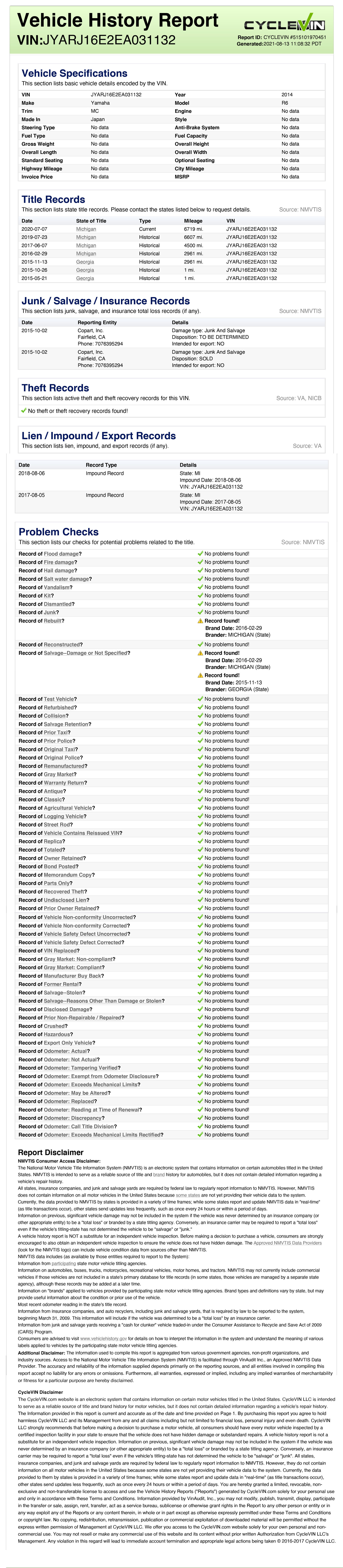 Buying a motorcycle is an exciting time. And you want to be sure that you are getting a good deal, right? Who wants to buy a motorcycle only to find out later there are any issues with it? The questions that you need to ask: Is the title is clean? What condition is the vehicle in? Has it been damaged, stolen, recalled? Has it been through a FLOOD?